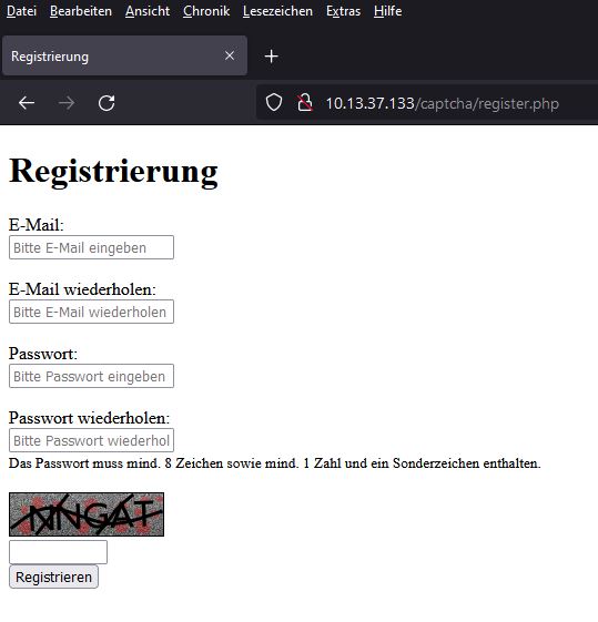 Zur Umsetzung haben wir am Anfang ein einfaches HTML-Formular entworfen, in dem man zum einen seine E-Mailadresse und das Passwort doppelt eingeben muss. Mit der doppelten Eingabe verringern wir die Gefahr auf Rechtschreibfehler. Anschließend haben wir uns dafür entschieden, ein sogenannten Captcha („Completely Automated Public Turing Test“) einzusetzen, um zu prüfen, dass es sich bei der Eingabe auch um einen Menschen handelt. Das Captcha besteht aus einer Länge von 5 Zeichen, die sowohl Buchstaben als auch Zahlen beinhaltet. Wir haben die Verwendung des Google-Captcha in Betracht gezogen , uns dann aber gegen die Verwendung entschieden. Der Grund dafür ist, dass bei jeder Nutzung persönliche Daten (z.B. in Form von Cookies) erhoben und an Google gesendet werden. Dieses Vorhaben kann man aus Datenschutzbestimmungen des Captchas entnehmen. Um SQL-Injection vorzubeugen, haben wir uns für die Verwendung der PHP-Methoden von „mysqli“ ausgesprochen. Damit können SQL-Statements in Variablen abgespeichert und auf die Datenbank angewendet werden. Zum Beispiel kann man so prüfen, ob die eingegebene E-Mailadresse schon in der Datenbank vorhanden ist. Somit erfolgt kein direkter Zugriff auf die Datenbank.